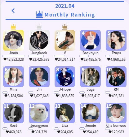 지민은 지난해 8월부터 주간, 월간 1위를 단 한번도 놓치지 않고 전체 2억2320만3885개의 하트를 받아 2위와는 1억 개 이상의 매우 큰 차이로 ‘명예의 전당’ 1위를 독주하고 있다.