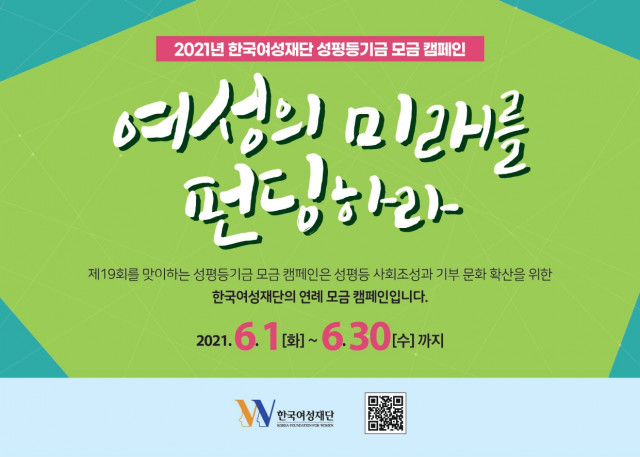 한국여성재단(이사장 장필화)은 ‘여성의 미래를 펀딩하라’ 슬로건 아래 6월 1일부터 30일까지 한 달간 ‘성평등기금 모금 캠페인’을 전개한다.
