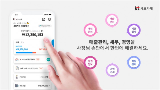 KT와의 제휴 협력을 통해 출시한 KT 세모가게는 소상공인 사장님의 가게 경영을 앱으로 간편하게 해결할 수 있도록 지원한다. 매출 통합 관리뿐 아니라 세무, 경영에 필요한 기능을 한데 모아 제공한다.